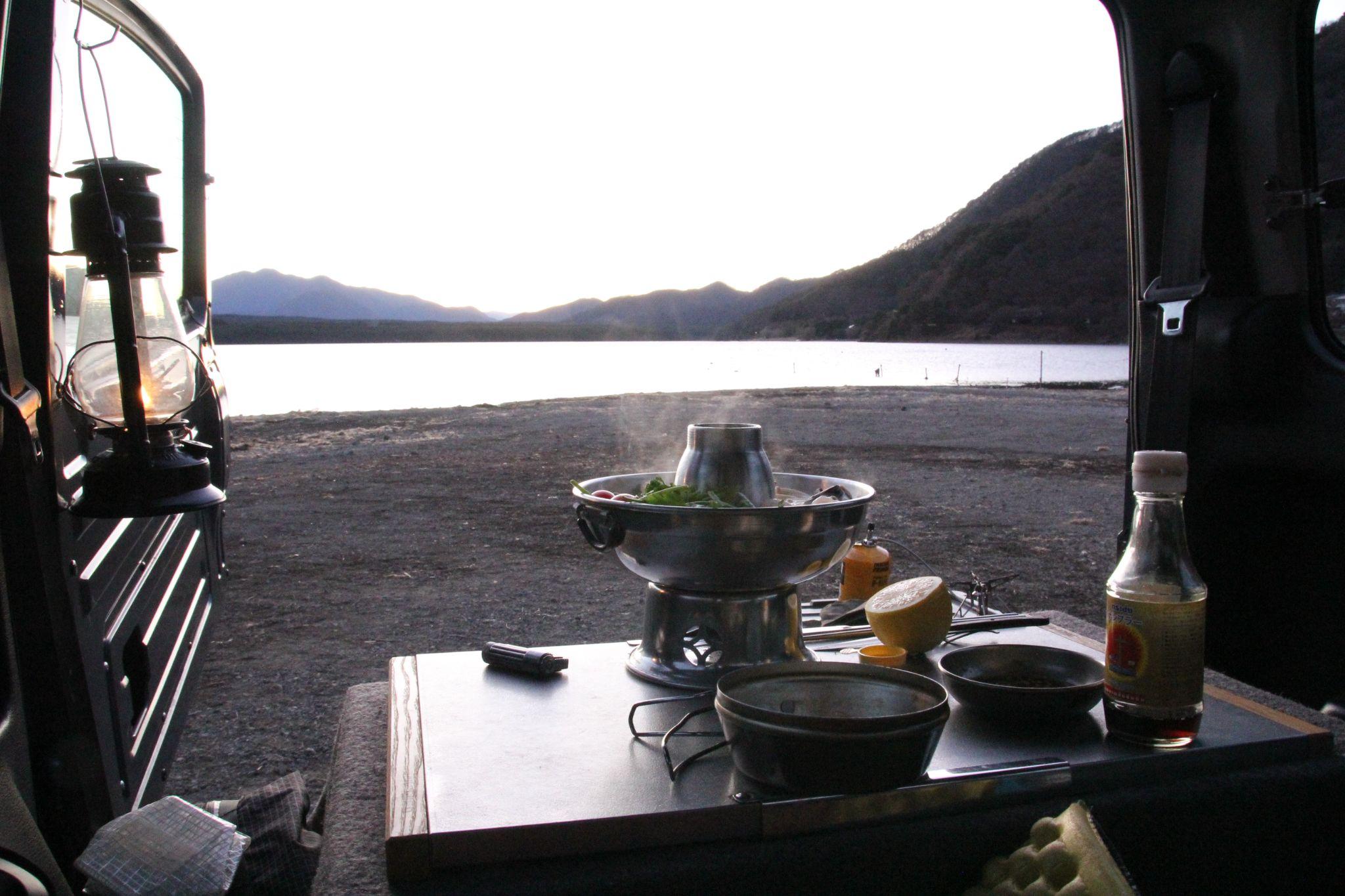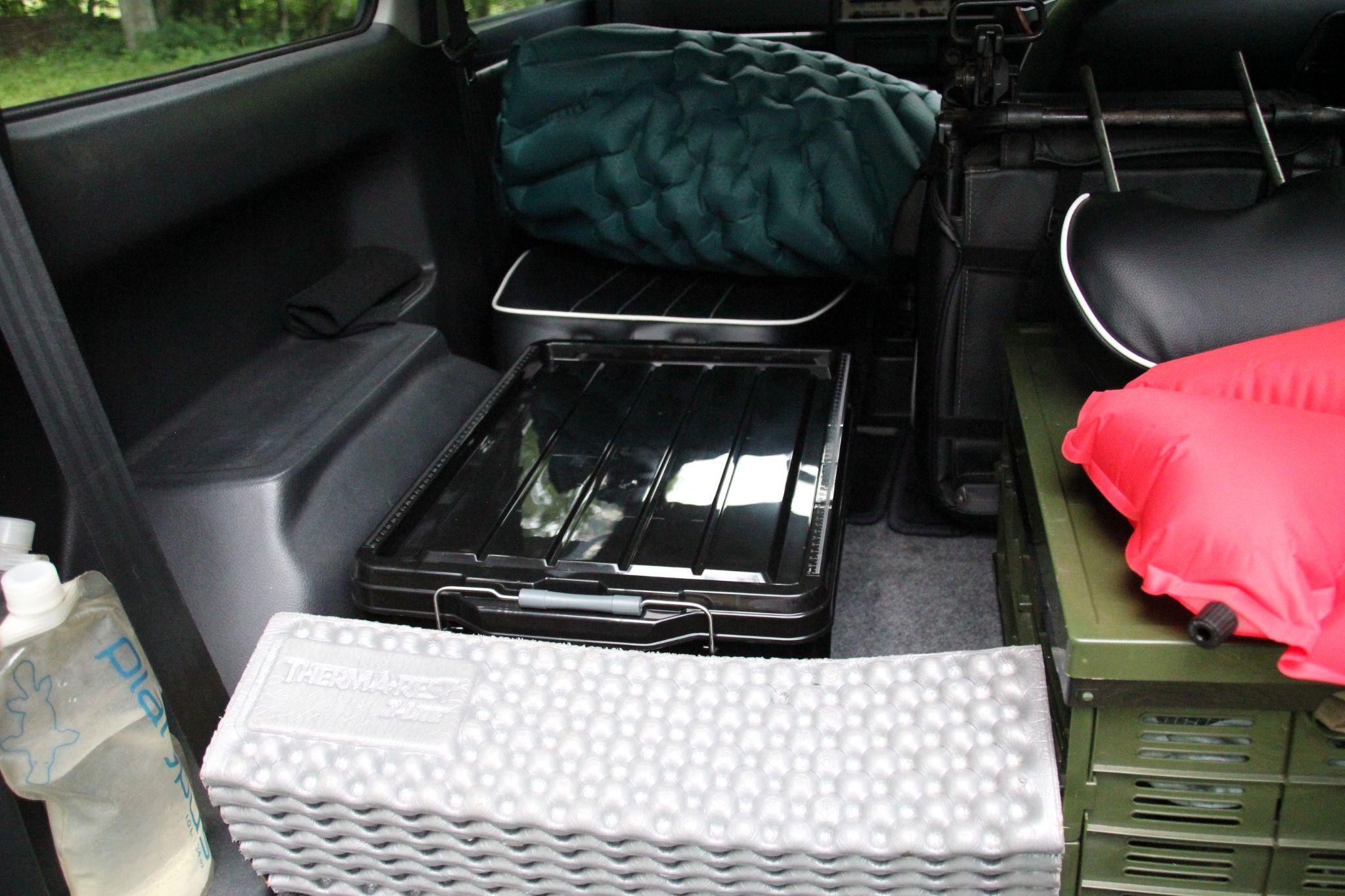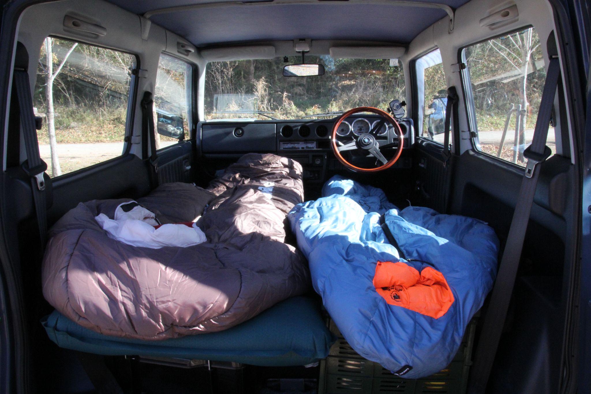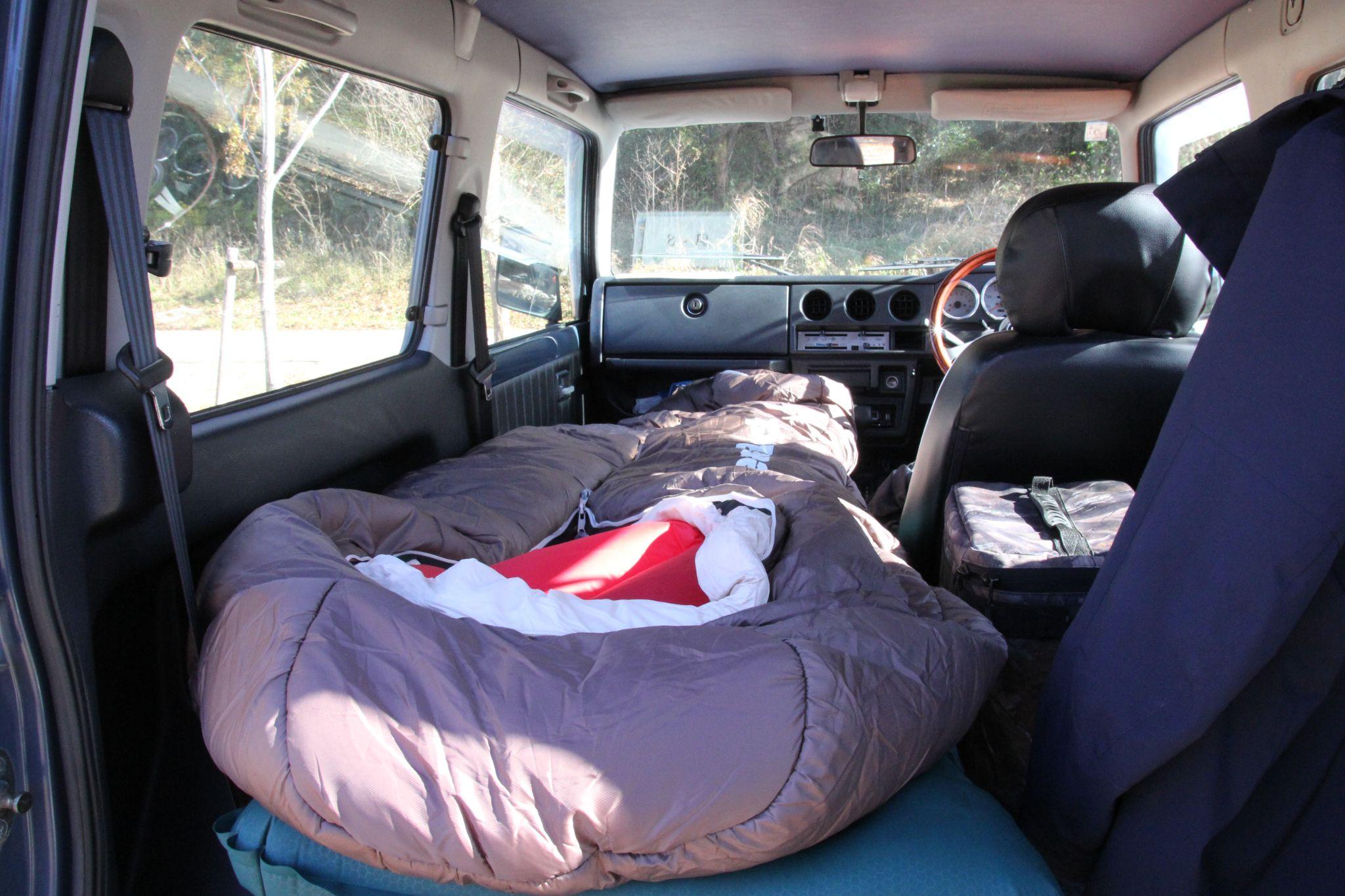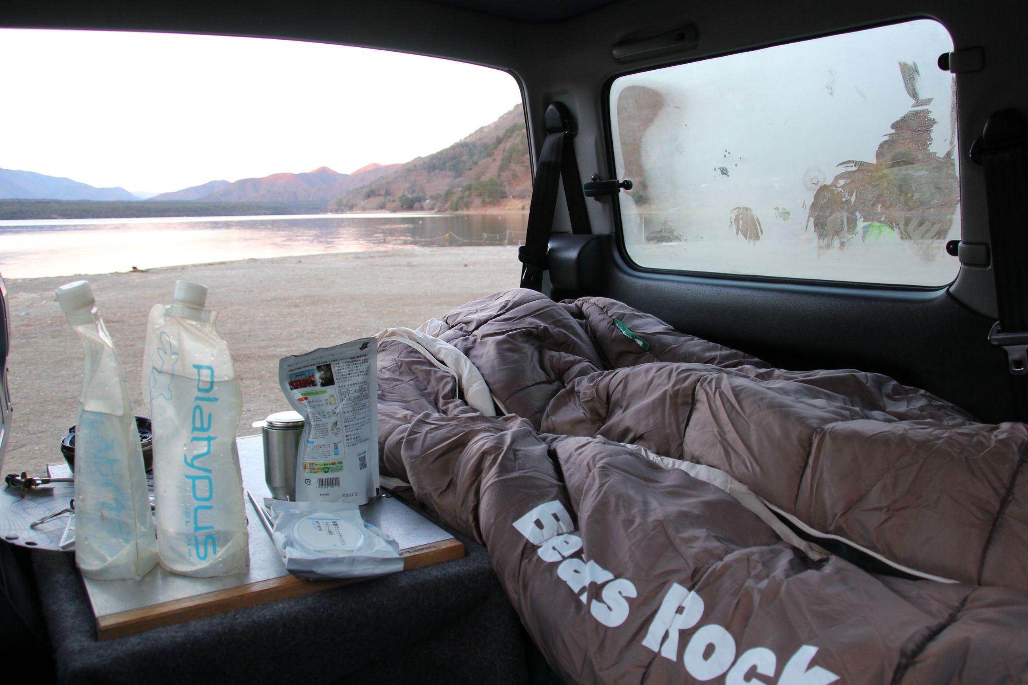 実際に2つの寝袋を冬の車中泊で使用して、寝心地や保温性について検証してみました。寝袋使用時は、湖畔沿いで-2、3度でした。筆者の車中泊はフルフラットにならない古いジムニーを利用したもので、ボックスやクッションを利用して平面を作り、エアマットを敷いてそこに寝袋を利用して就寝するスタイルで行っています。