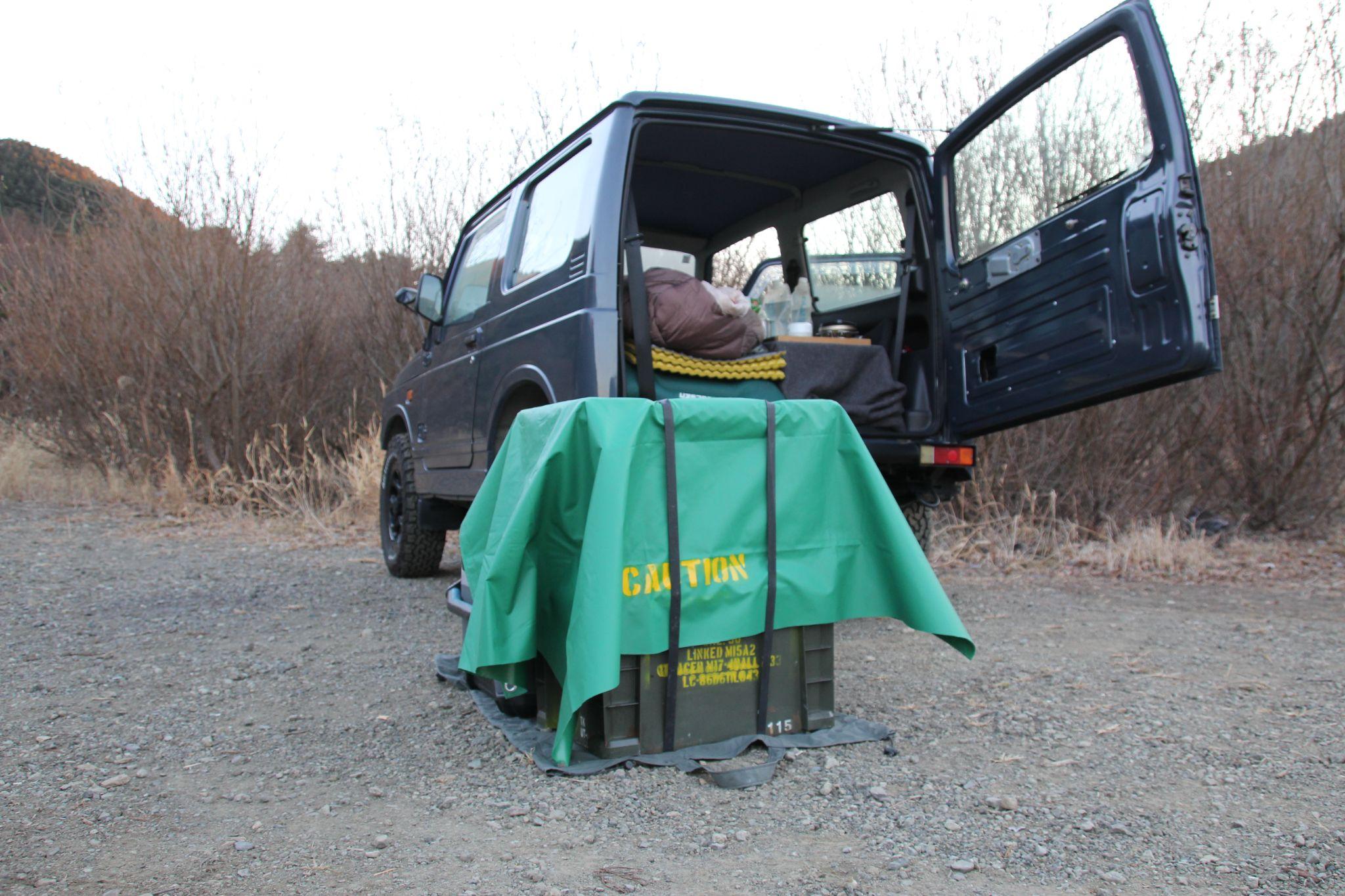 もう一つの自作キャンプギアは防水シート付の収納ボックスです。ミリタリー風にペイントして仕上げてあります。狭いジムニーで車中泊をする場合に荷物を外に出さないと、就寝することができないので、風雨にさらされても荷物が濡れないようになっています。ボックスに施した錆び加工により使っていくうちにエイジングが進むのではないかと楽しみにしています。