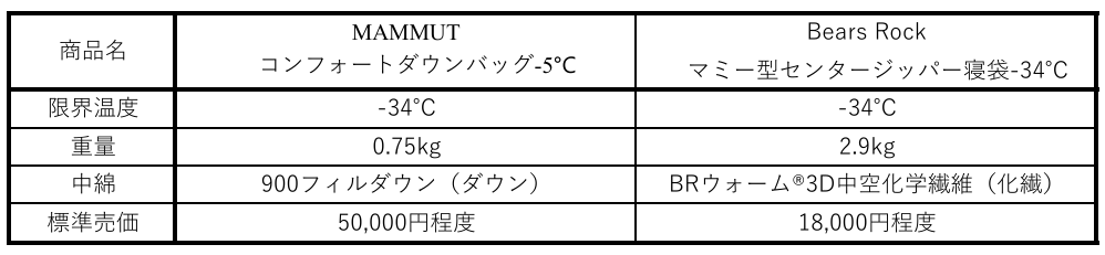 両者とも使用下限温度(体温を保てる限界の温度)は-34℃となっており、それぞれの見た目の違いは化繊とダウンの素材の特性を表したものになっています。MAMMUTのダウン寝袋はコンパクトで軽量、Bears Rockの化繊寝袋は重くサイズも大きいという印象です。