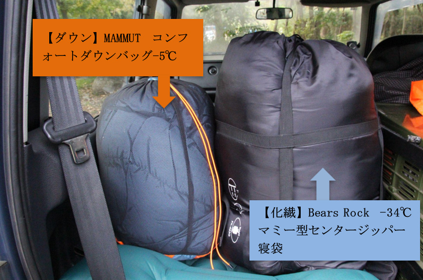 今回化繊のBears Rockの寝袋とダウンのMAMMUTの寝袋を比較しましたが、車中泊中心にキャンプを行っている現在の自分に合っているのは「Bears Rockの寝袋」で、選んだ一番の理由はフルフラットにならない車内環境を寝袋のクッション性で快適にしてくれた点です。この事実はダウンの寝袋を中心に使っていた人間として今まで感じたことがなく非常に驚いた点です。