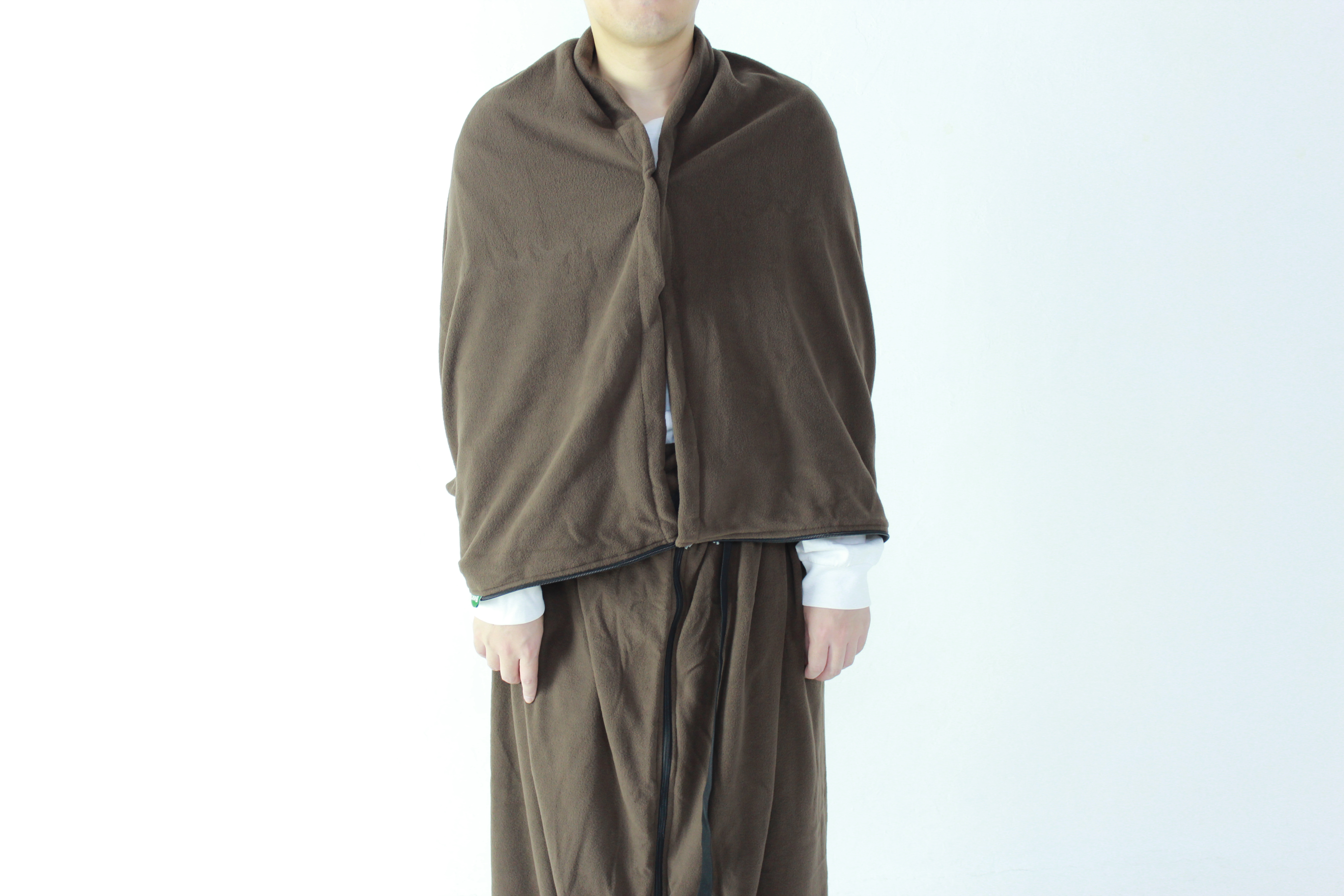 寝るとき以外に寒いときは、ひもが1本あればポンチョ風の防寒着として使えます。