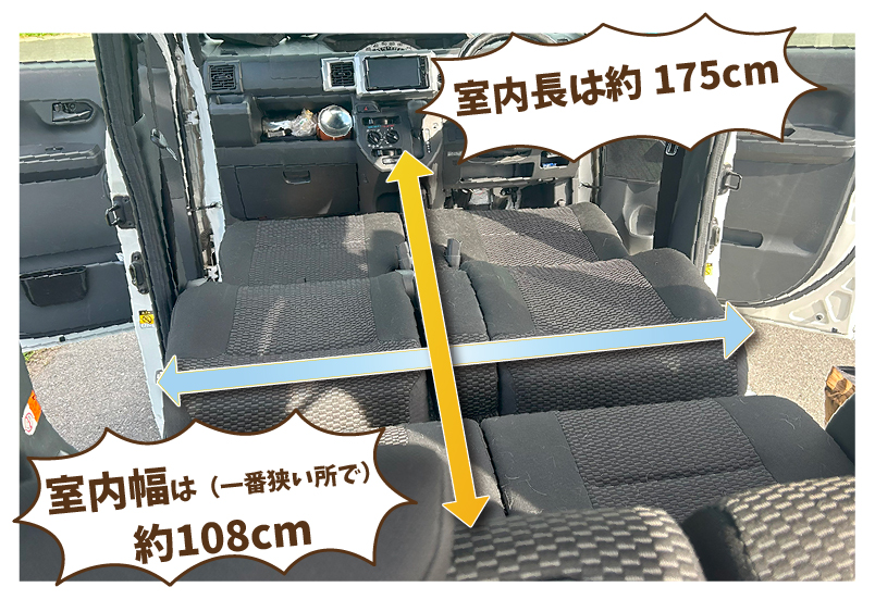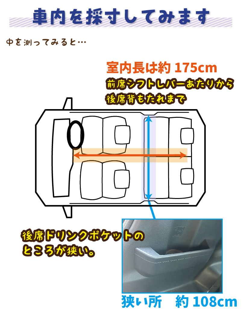 ウェイクの室内幅は狭いところで約108cm。室内長は約175cm。ここにマット2枚を敷けるかどうかが重要だね。