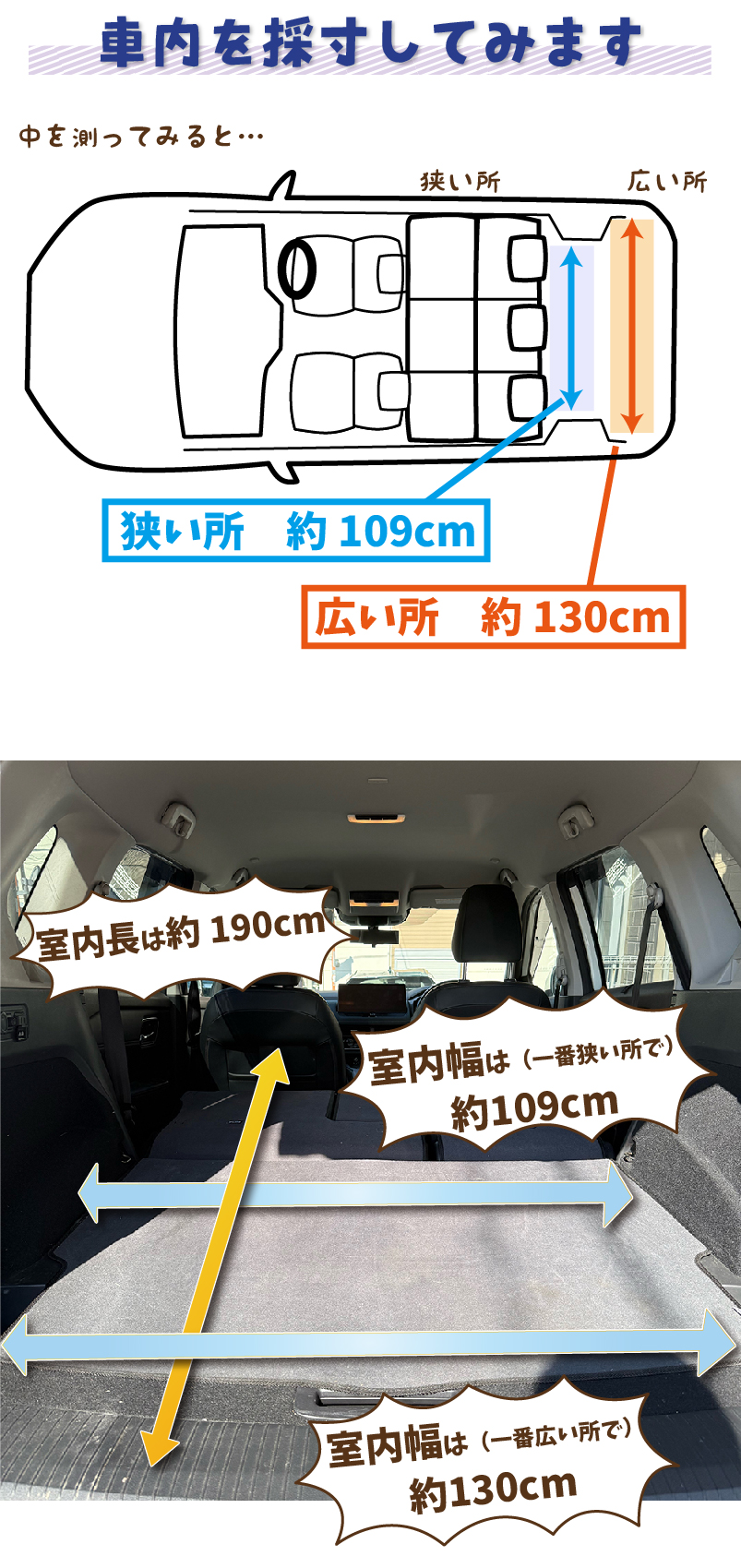 一番狭いところは荷室のタイヤハウスの出っ張りのところで、約109cm。広いところは荷室の後部で約130cm、室内長は前席背もたれから荷室の後端まで約190cmでした。