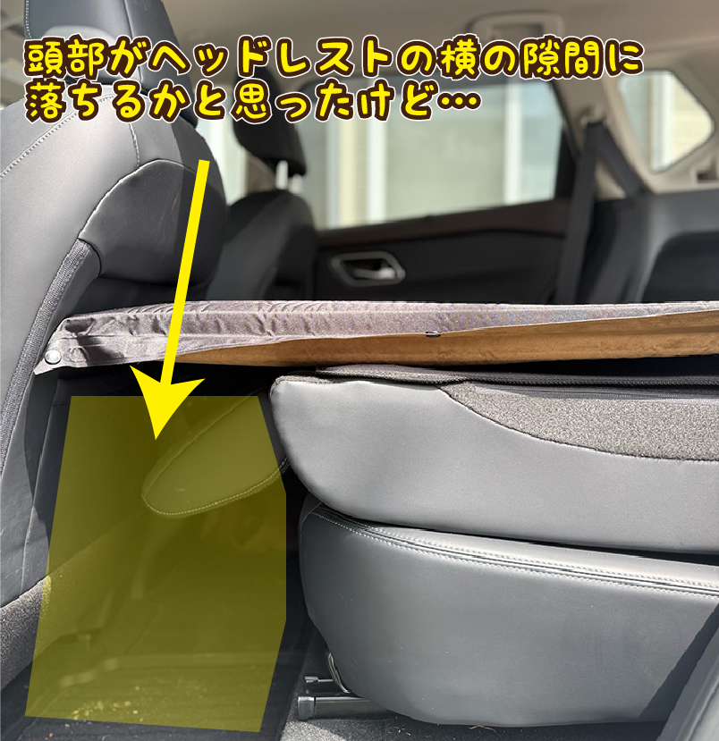 段差(くぼみ)はしっかり解消できました。頭部がヘッドレストの左右の隙間に落ち込むかと思いましたが、マットのハリでしっかり支えてくれます。後部座席の足元に荷物を詰めて、頭部の落ち込み対策を考えていましたが、その必要はありませんでした。