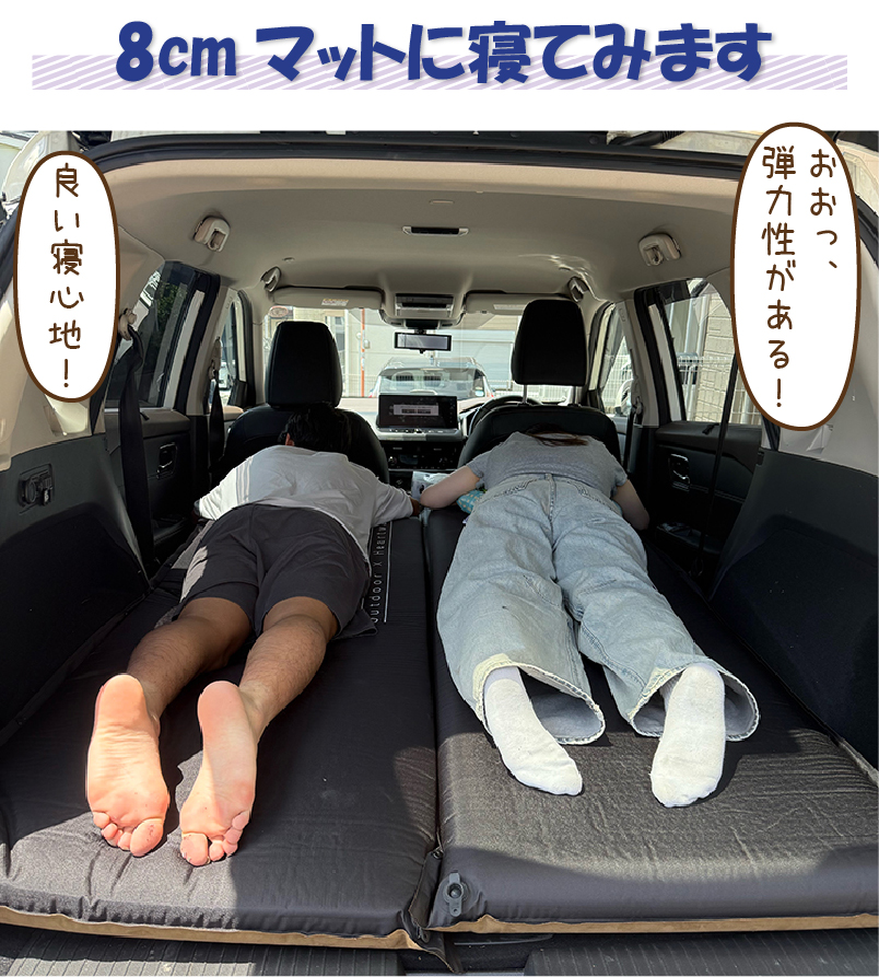 このたび使用した8cmマットはエクストレイルにぴったり収まるし、段差を解消して寝心地がよく満足いくものでした。使うときに空気弁を開けるとすぐに膨らみました。1分ぐらいでだいたい膨らみました。柔らかめが好きな人はこれで準備完了、私は電動のエアーポンプで数十秒重鎮して使いました。(エアーマットとラーメンは固めが好きです。)