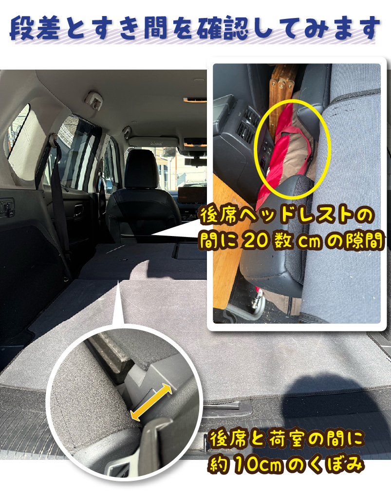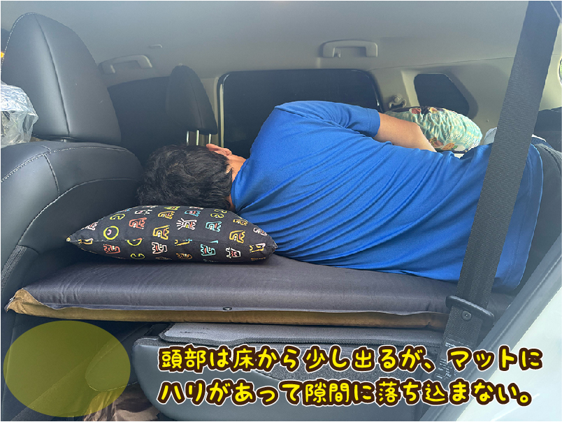 車内の細かな段差をしっかり解消してくれます!寝たとき頭部が床面からはみ出ますが、マットが支えてくれるので落ち込みません。