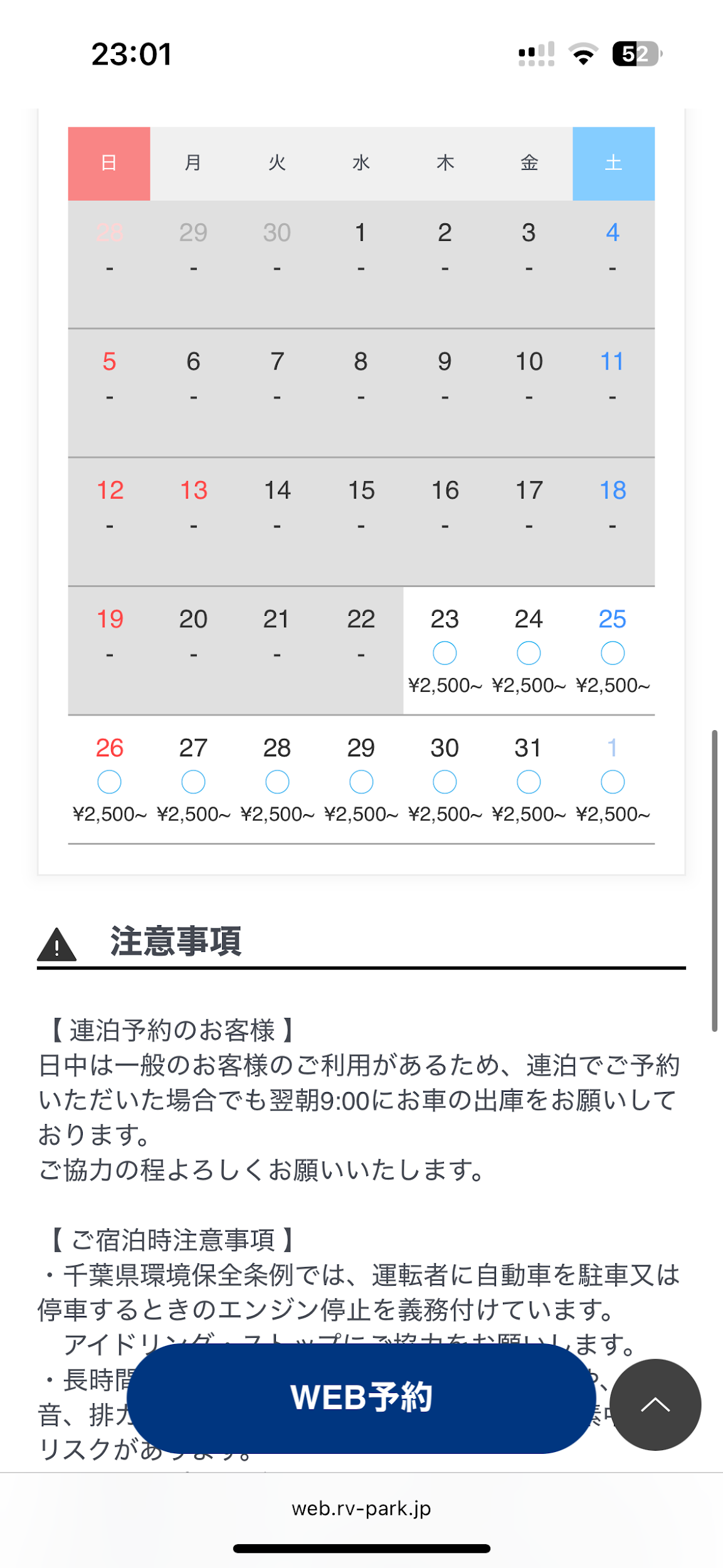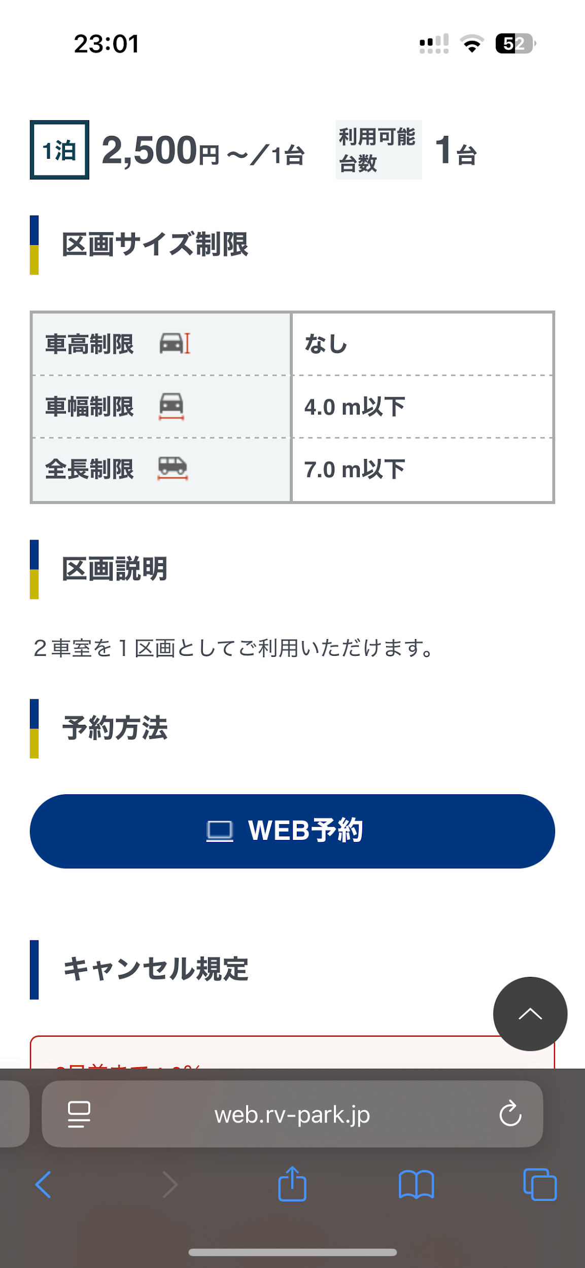 予約は事前にRVパークのホームページから可能です。ホームページ上の案内に従って予約を進めると5分程度で簡単に予約ができました。