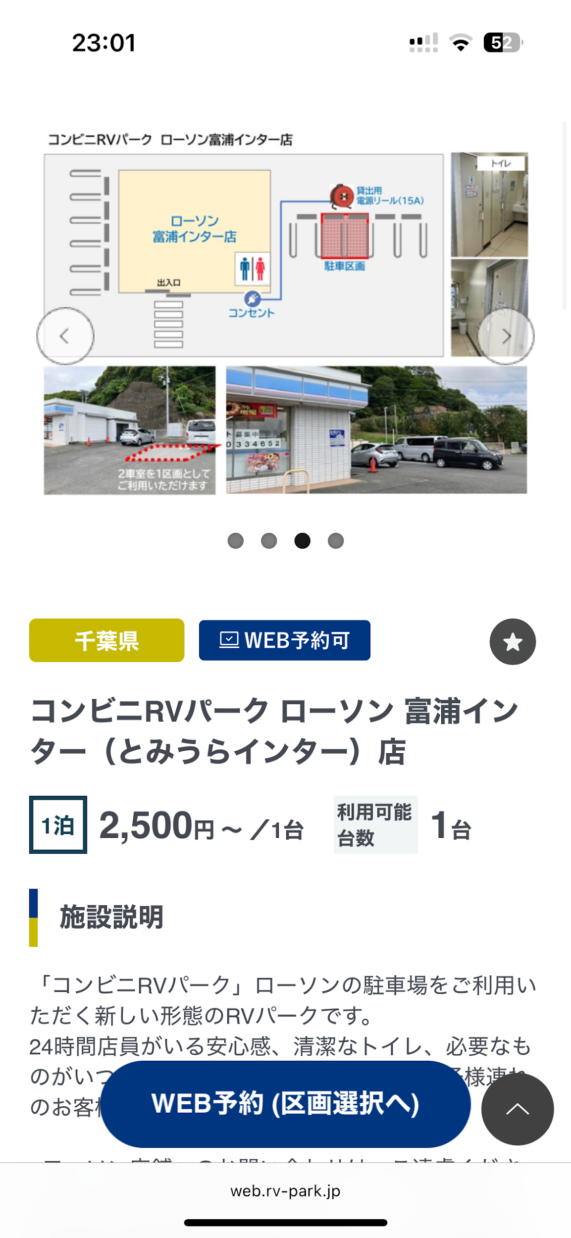 私自身、子供を連れての車中泊ということもあり、24時間営業のコンビニが敷地内にある安心感から「ローソンRVパーク」を利用することに決めました。