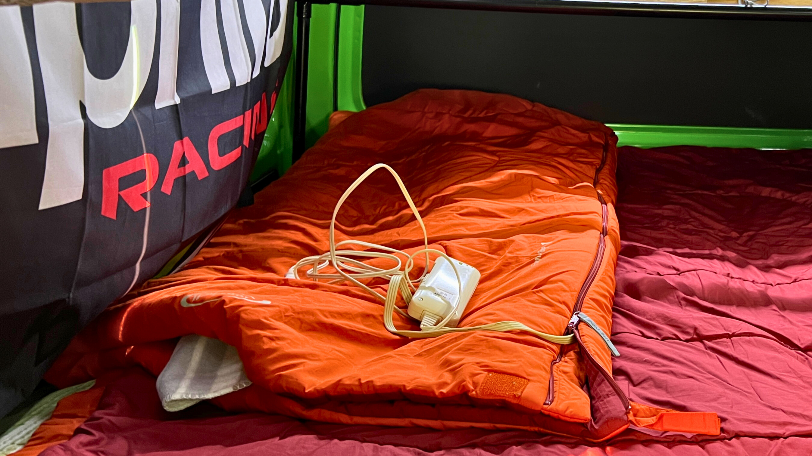 現在我が家では、上記に加えモンベルの「ファミリーバッグ#1」を使用しています。この寝袋は快適温度-1度まで対応していますが、マイナス10度近くになるとさすがにこれだけでは寒いため、羽毛ブランケットやフリース素材のインナー寝袋を組み合わせ、さらに電気毛布も併用しています。そのため、ポータブル電源も冬の車中泊に必須のツールとなっています。