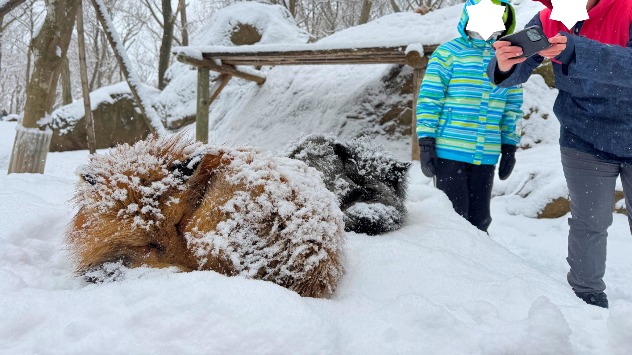 蔵王にあるキツネ村。真冬なので、キツネたちもモコモコの冬毛におおわれています。