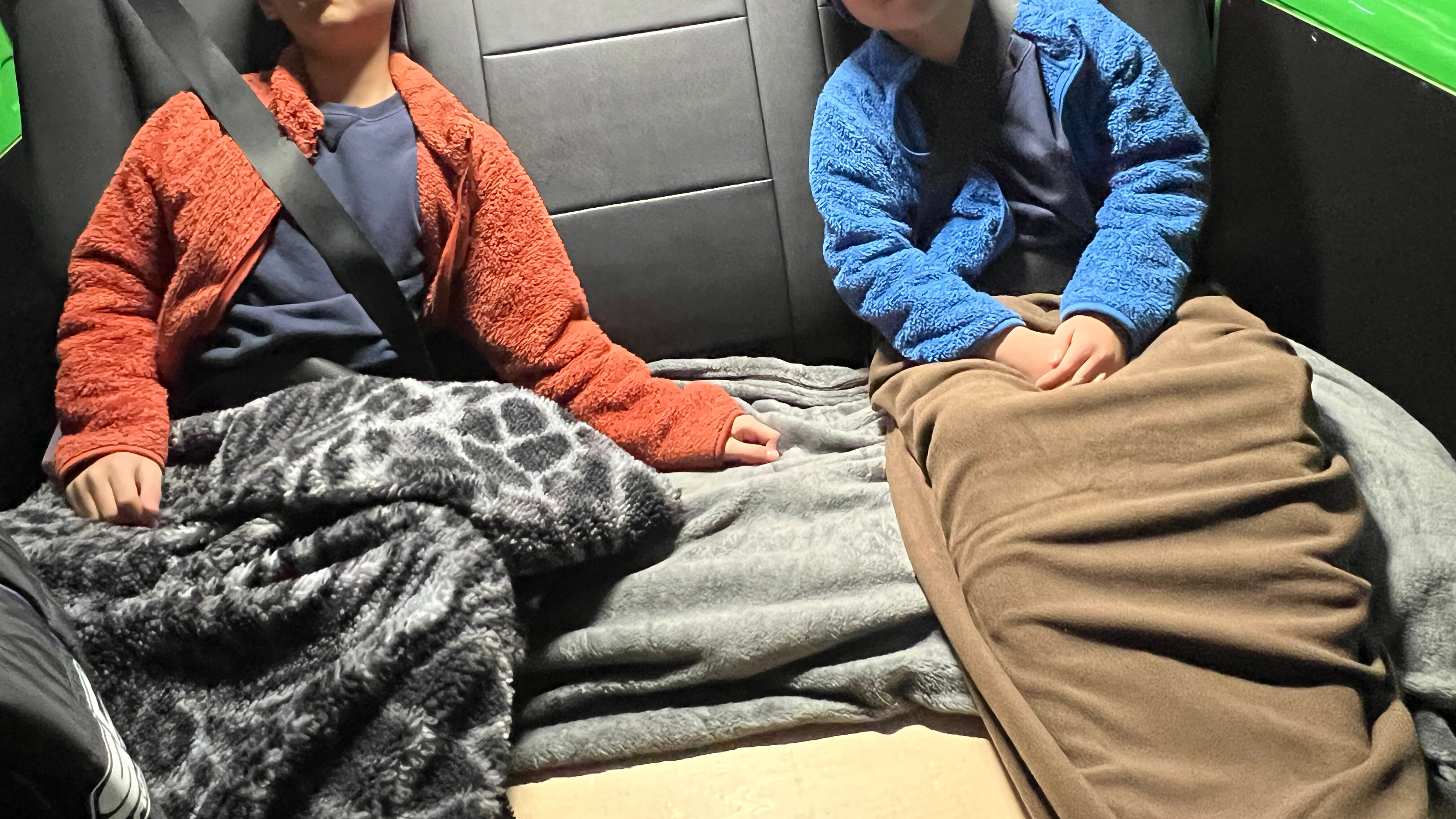 温風の届かない後部座席の子どもたちを重点的に守るために、フリース素材のインナー寝袋を活用しています。足先が袋状になっているタイプのものなら、移動中に寝てしまっても毛布がずれ落ちることがなく、足元がしっかり温まります。さらに、全身を覆えるような大き目の毛布を組み合わせれば、しっかり保温できます。