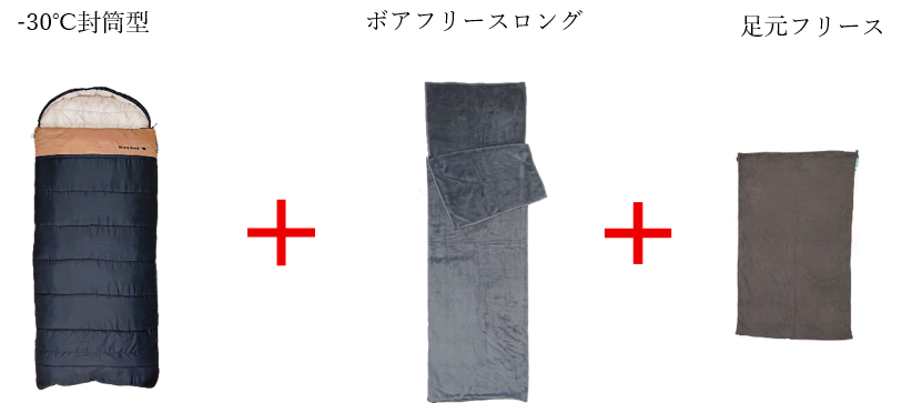 ・寝袋付属の足元インナーフリースとボアフリースロングを使用