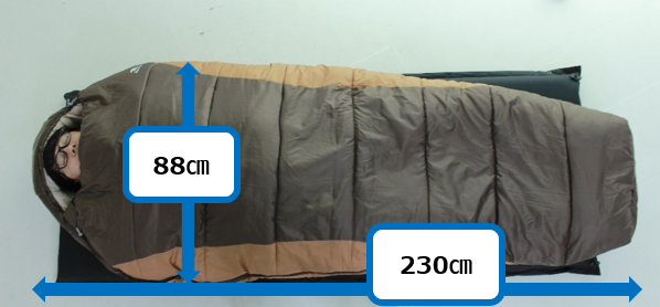 特徴:中綿がふんわりとしていて体にほどよくフィットするためとても温かい。封筒型に比べ、包み込まれるような寝心地。マミー型としては大きめサイズ。横が88㎝もある。
