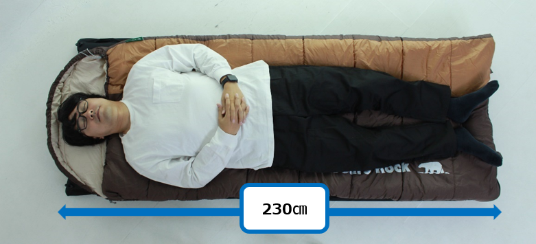 *縦サイズ230cmの寝袋に横になったマサキさん(182cm)のイメージ