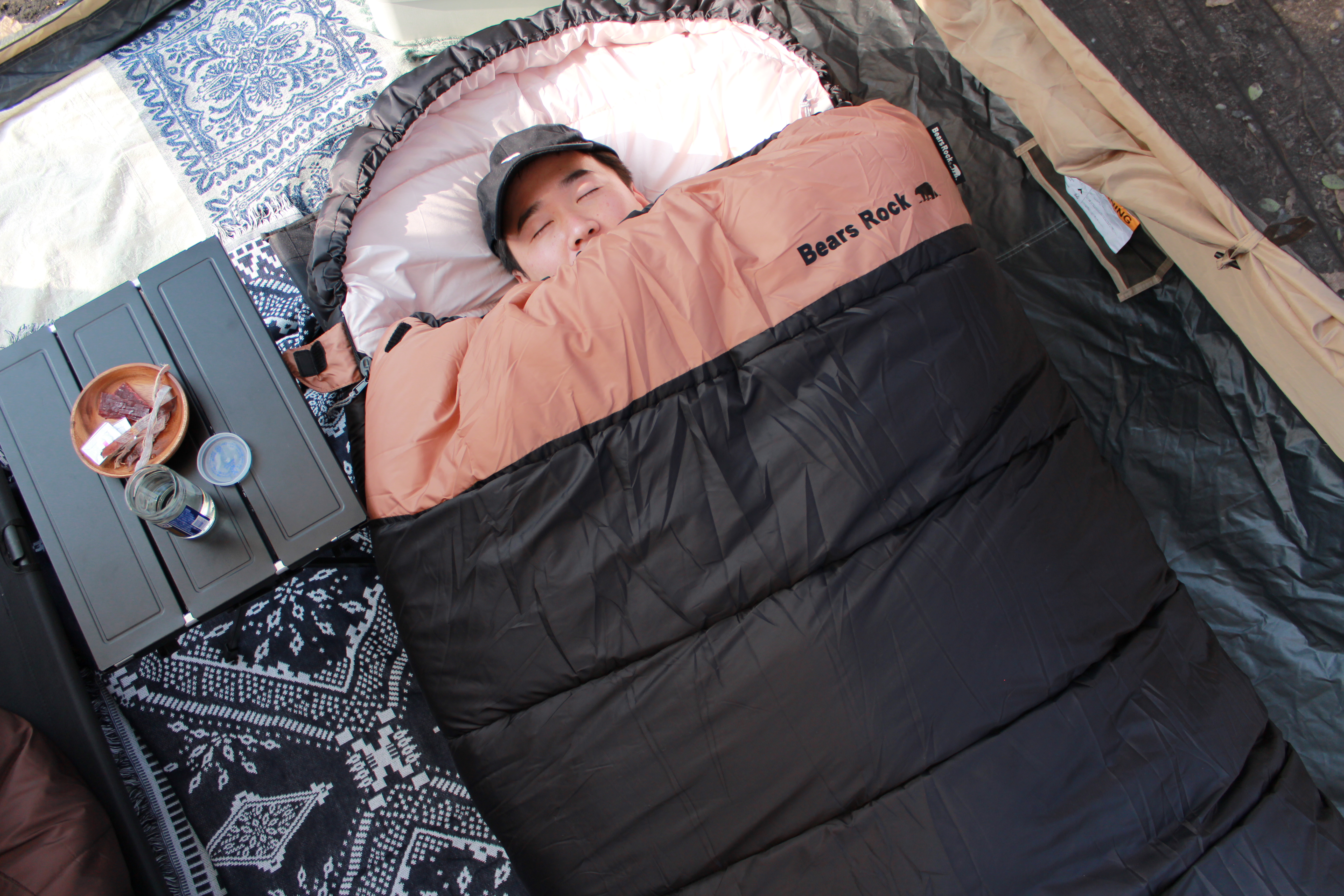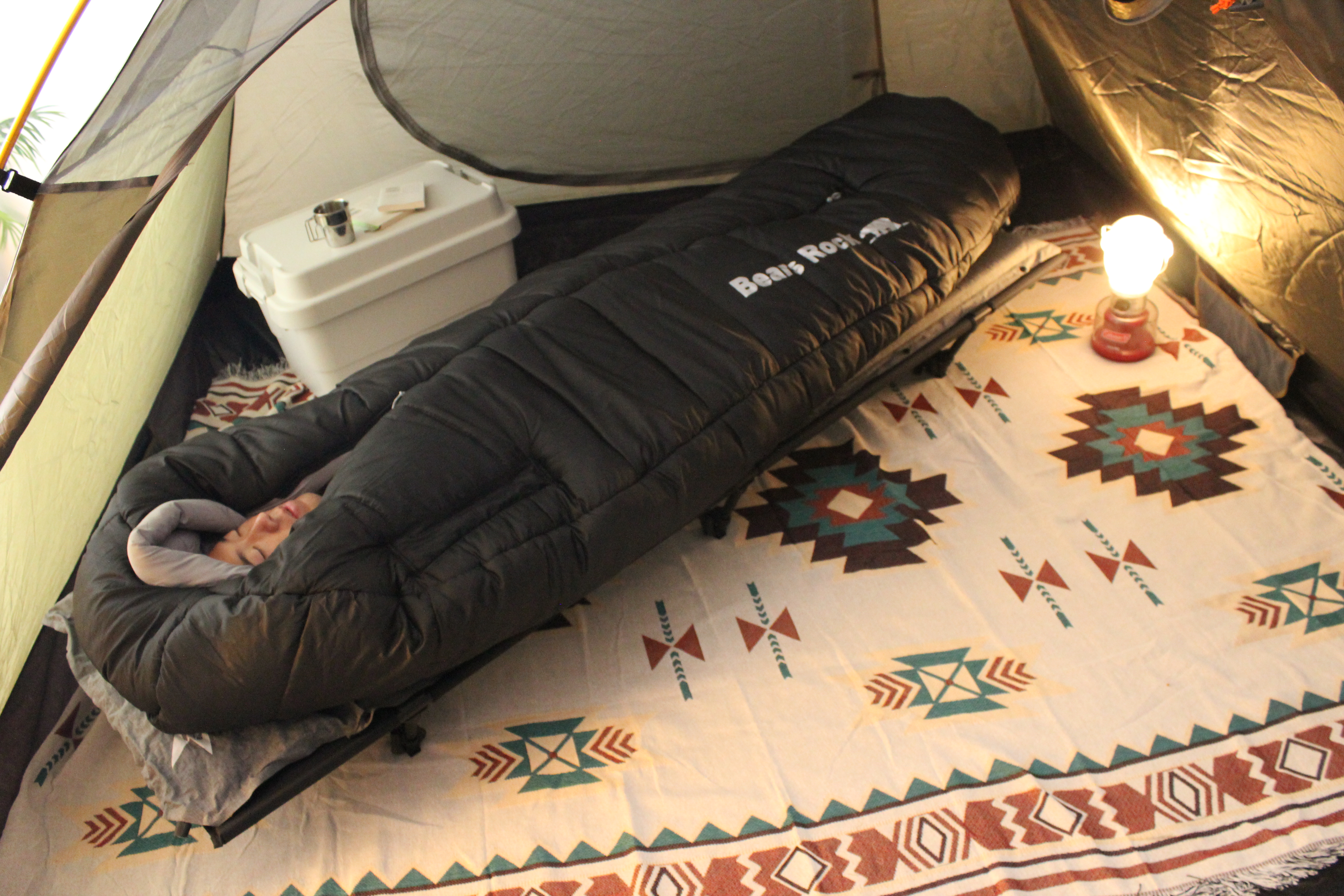 ②幅広でフカフカのシュラフは、寝返りもできてまるで布団のような寝心地だと思いました。また、保温性も高く極寒キャンプでも湯たんぽ併用で、ぬくぬく朝までぐっすり熟睡できました。