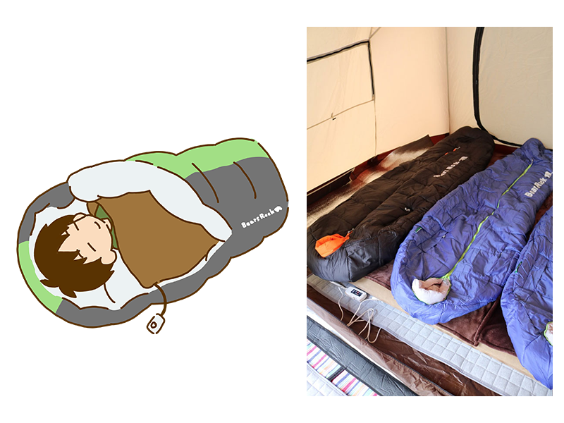 限界温度-15℃クラスでも寝られないことはないが、電気毛布やカイロなどがあると寝袋に入れたり、寝袋の下に敷くなどして温度の調整がしやすい。
