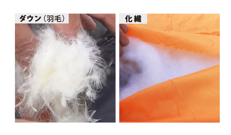 中綿の素材の、ダウンと化繊はそれぞれ特徴が異なります。ダウンは軽くてコンパクトであるのが特徴です。上質な羽毛はふわ~っと大きくふくらむので、大きな空気層をつくり、あたたかい空気をたくさんため込むことができます。化繊は上質な羽毛のように綿自体が大きくふくらみはしませんが、冬用の寝袋には、たくさんの中綿が注入され、空気層を大きくつくり、あたたかい空気をため込みます。