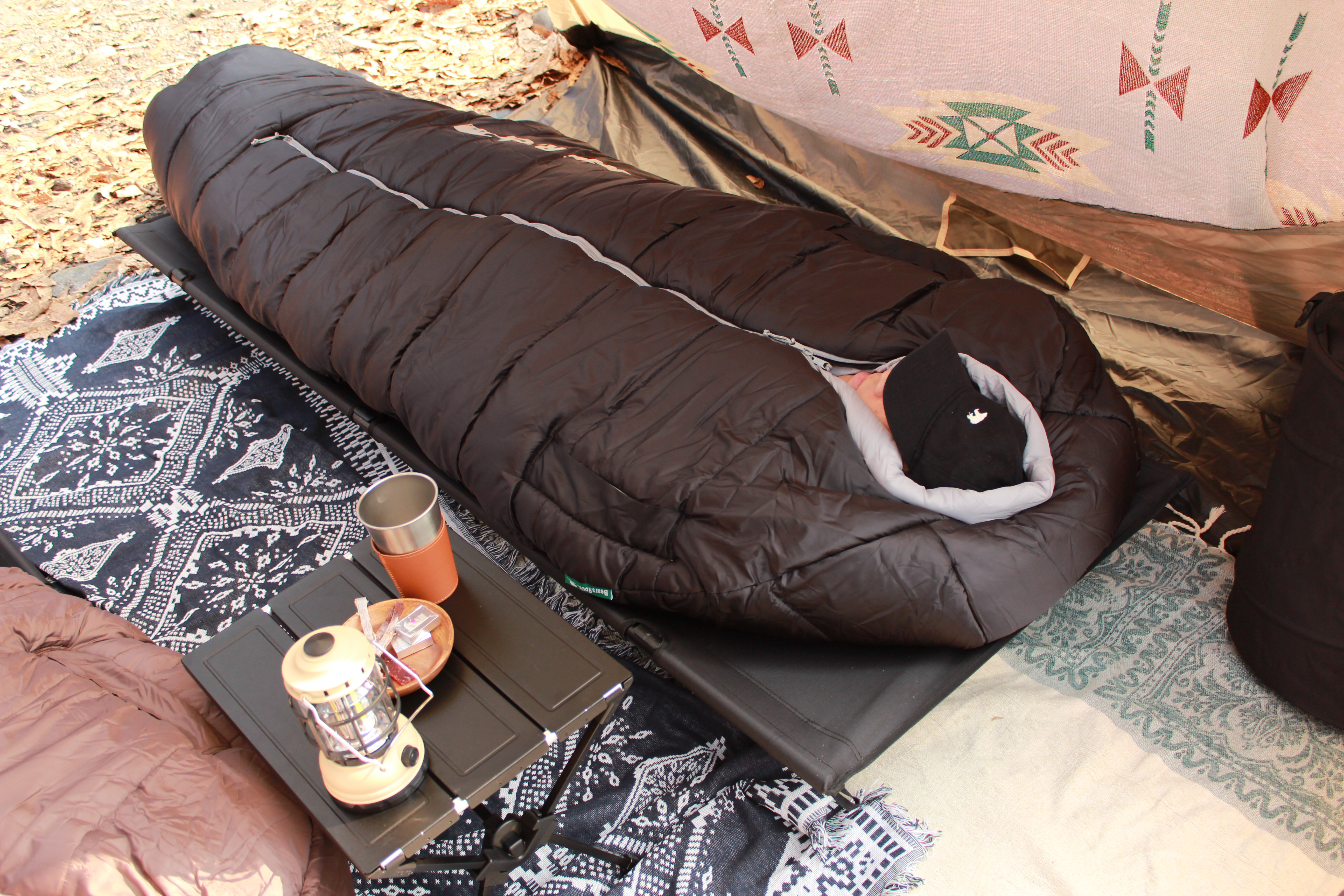 冬キャンプではコットを置いて、限界温度-15℃のダウン+電気毛布を使っています。電気の力もありますが、これで十分あたたかく寝られます。ただ、問題点が2つあります。