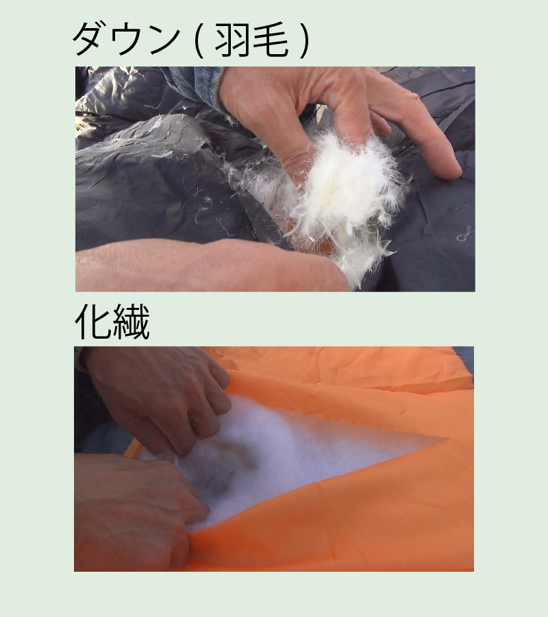 •ダウン:軽量で保温性が高く、コンパクトに収納可能です。ただし濡れると保温性が下がるため、雨や湿気が多い環境では注意が必要です。