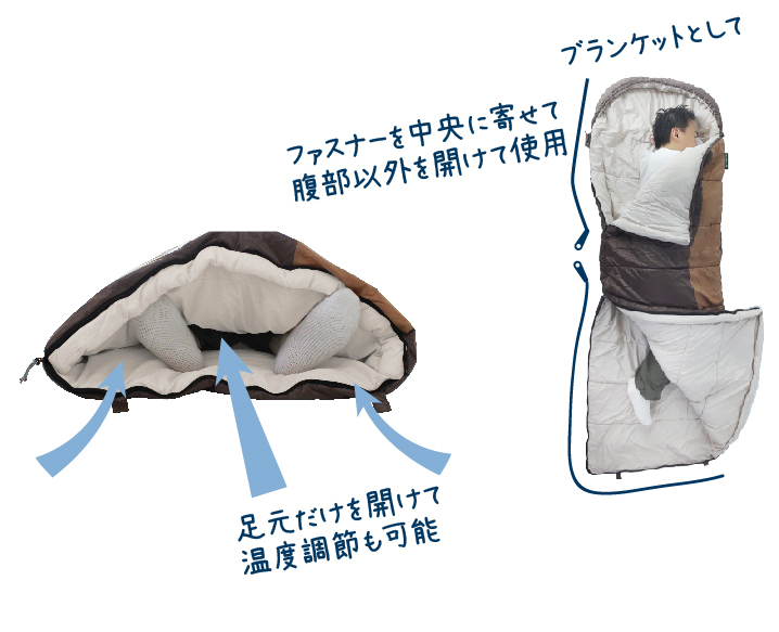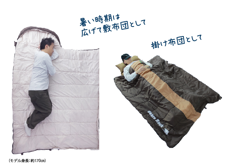 また夏の暑い時期は広げて敷布団や掛け布団にしたりと使い勝手の良い寝袋です。